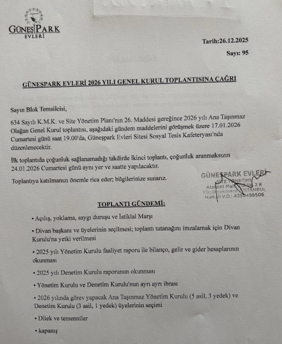 634 sayılı Kat Mülkiyeti Kanunu ve Site Yönetim Planı'nın 26. Maddesi gereğince, 2026 yılı Ana Taşınmaz Olağan Genel Kurul Toplantısı, gündem maddelerini görüşmek üzere 17 Ocak 2026 Cumartesi günü saat 19.00'da, Güneşpark Evleri Sitesi Sosyal Tesis Kafeteryası'nda düzenlenecek.